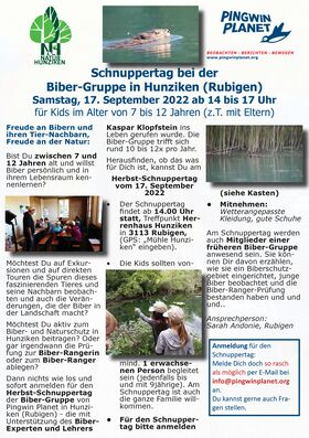 Am Samstag, 17. September 2022 findet der Herbst-Schnuppertag bei der Biberschutzgruppe Hunziken (Rubigen/BE) von 14 bis 17 Uhr statt. Für Kids zwischen 7 und 12 Jahren in Begleitung von Eltern.