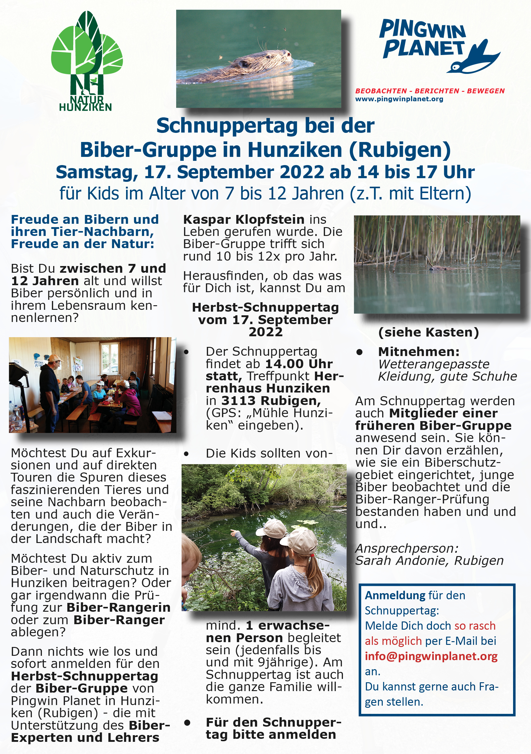 Viel über Biber und ihre Tierfreunde lernen, Biberschutzgebiete einrichten und pflegen, Biber beobachten und eventuell die Prüfung zur Biber-Rangerin oder zum Biber-Ranger absolvieren: Genau zu diesem Zweck und anderen schönen Naturerlebnissen treffen sich seit ein paar Jahren Kids von 7 bis 12 Jahren 10 bis 12 x pro Jahr auf dem Naturgelände in Hunziken (Rubigen), wo auch Pingwin Planet seit einigen Jahren zu Hause ist.