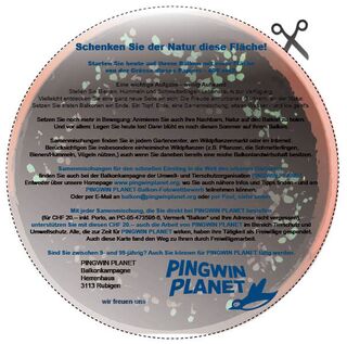- oder Sie laden unseren Topfflyer im Downloadbereich weiter unten herunter und drucken ihn aus und schneiden ihn dann mit Schere oder Kreisschneider (kann z.B. HIER bestellt werden) rund aus - und verteilen Ihre Ausdrucke im Quartier. Auch wenn der Ausdruck oder Schnitt nicht perfekt sein sollte: Erstens setzt Pingwin Planet nicht auf Perfektionismus, sondern auf Aktivität, auf Bewegung. Zweitens bewegen Sie so vermutlich noch viel schneller die Balkone Ihrer Umgebung Richtung mehr Natur.