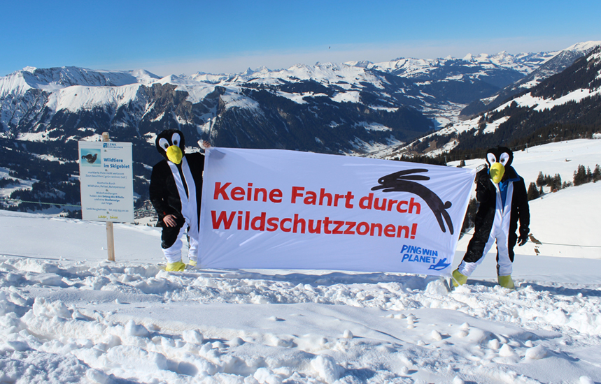 Eine namhafte Zahl von Wintersportlern foutiert sich jedoch um solche Erkenntnisse und um Absperrvorrichtungen und Verbotstafeln, die zum Teil sogar Strafanzeigen androhen und fährt unverfroren durch die gekennzeichneten Wildtier-Lebensräume, wie Pingwin Planet in verschiedenen Skigebieten in Pistennähe festgestellt hat. Freiwillige von Pingwin Planet bewachten deshalb heute im Skigebiet Adelboden-Lenk (im Raum Metschstand/Hahnenmoos) solche Wald- und Wildruhezonen, um Ski- und Snowboardfahrer vom verbotenen Eindringen in diese Zonen abzuhalten oder sie zumindest für die Problematik zu sensiblisieren. Die Aktivisten brachten auch zusätzliche Informationstafeln an, welche vom Durchfahren der Wildruhezonen abhalten sollen. Eine andere Gruppe von Freiwilligen von Pingwin Planet verteilte Flugblätter mit Informationen zur Aktion.